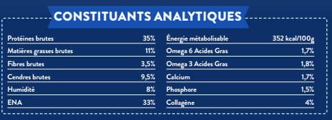 Saumon d’Écosse : Votre recette de saumon contient du saumon d’Écosse fraîchement préparé. Le saumon d’Écosse est généralement nourri avec des aliments de meilleure qualité et l’élevage est moins intensif avec moins de poissons en cage, ce qui signifie qu’ils peuvent nager plus loin et développer plus de muscles. 65 % de Saumon au total : Riche en acides aminés, en vitamines et en minéraux essentiels pour contribuer à la santé et au bien-être quotidien de l’animal. Minimum 35% de saumon d’Ecosse fraîchement préparé.