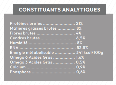 - 60 % de saumon (dont 39 % de saumon fraîchement préparé, 21 % de saumon déshydraté), patate douce (26 %), huile de tournesol, pomme de terre, levure de bière, huile d’olive, bouillon de poisson, protéines de pomme de terre, protéines de pois, minéraux, supplément d’oméga 3, carottes déshydratées, asperges déshydratées, extrait de yucca (190 mg/kg).