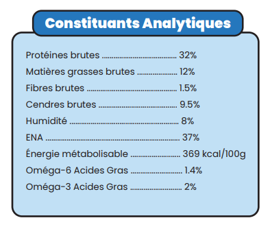 - 60 % de saumon (dont 39 % de saumon fraîchement préparé, 21 % de saumon déshydraté), patate douce (26 %), huile de tournesol, pomme de terre, levure de bière, huile d’olive, bouillon de poisson, protéines de pomme de terre, protéines de pois, minéraux, supplément d’oméga 3, carottes déshydratées, asperges déshydratées, extrait de yucca (190 mg/kg).