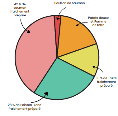 80 % de poisson fraichement préparé et cuit doucement à la vapeur 80 % de la recette est fabriquée avec les meilleurs ingrédients.